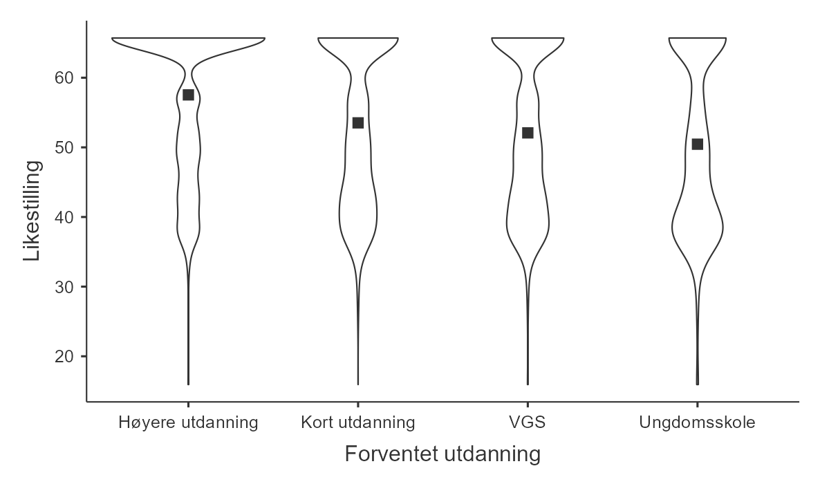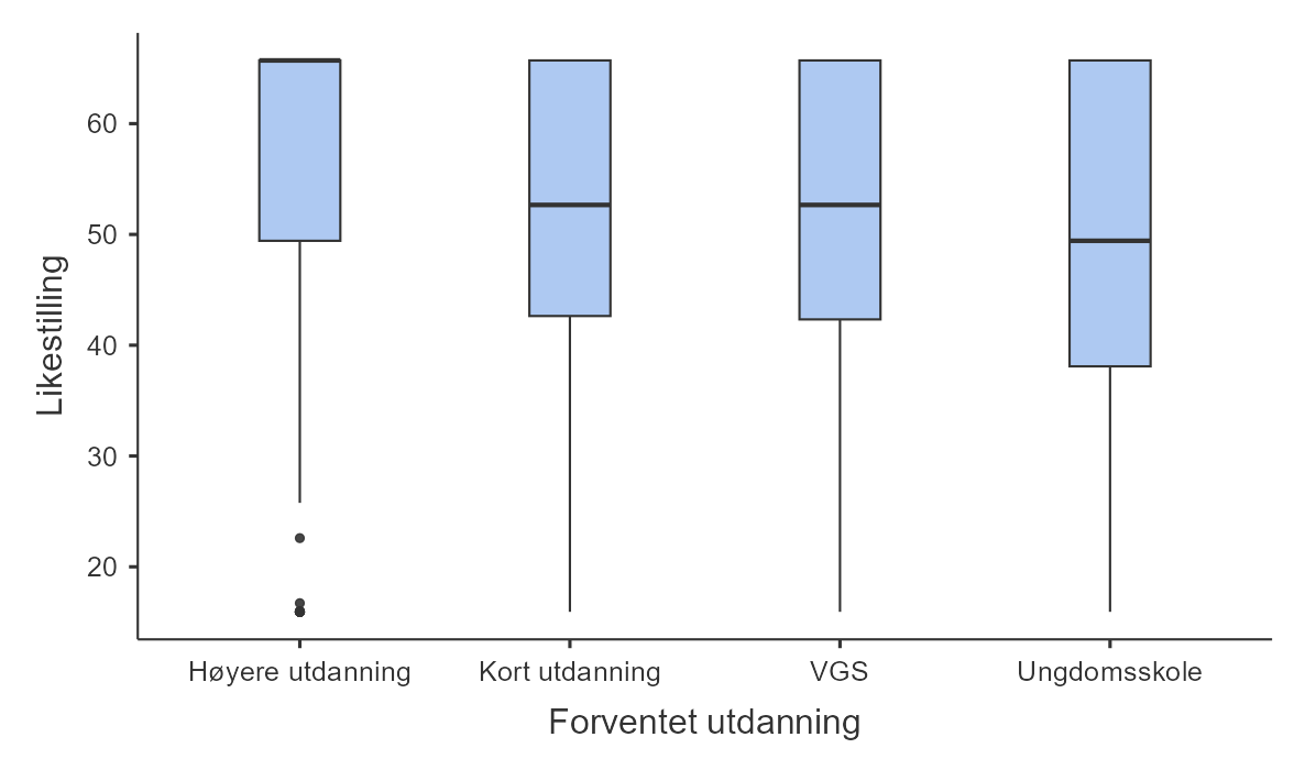 Du er kanskje ikke så imponert over boksplottet og synes histogrammet ga mer informasjon, og jeg er litt enig. Boksplottet viser riktignok medianen og kvartilbredden, men histogrammet viste mer nøyaktig hvordan verdiene fordelte. Boksplottet kommer til sin rett når man gjør en undergruppeanalyse, slik som i Figur 5.13. Det er rett og slett vanskelig å se forskjell på undergruppene med histogrammet, men med boksplottet er det lett å se at dess høyere utdanning eleven ser for seg, dess mer er eleven for likestilling mellom kjønnene. (Men merk at dette gjelder på gruppenivå og at det er mange unntak.) For å lage slike boksplott i jamovi er det bare å legge til en variabel i vinduet “Split by”.
