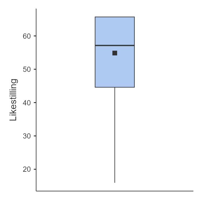Et flott alternativ til histogrammer er boksplott. Ideen bak et boksplott er å gi deg en rask og tydelig visuell oversikt over medianen, kvartilbredden og variasjonsbredden i dataene dine. Siden denne informasjonen var enkel å regne ut også før datamaskiner ble vanlig, og fordi boksplott presenterer all denne informasjonen på en kompakt måte, er boksplott blitt populære – spesielt når du utforsker dataene for første gang og prøver å forstå hva de forteller deg. Vi tar en titt på variabelen Likestilling, se i Figur 5.12. For å lage et boksplott i jamovi trykker du på akkurat de samme knappene som for et histogram, du bare krysser av for “Box plot” i stedet for.