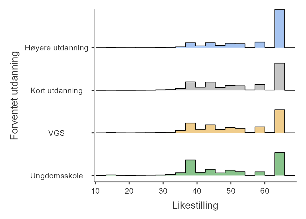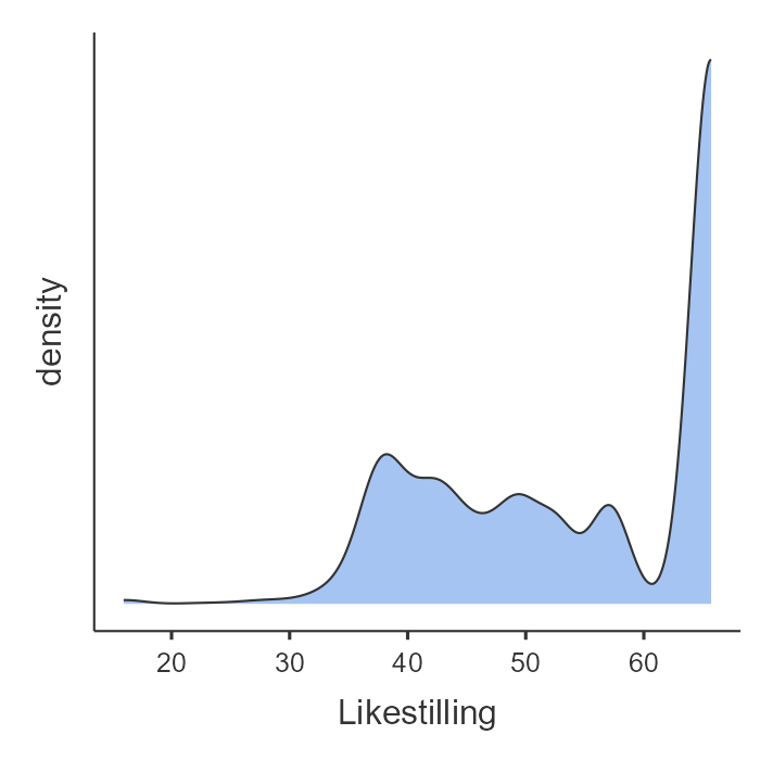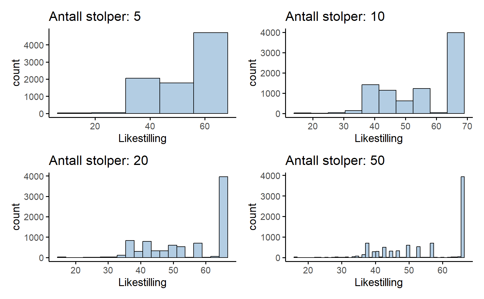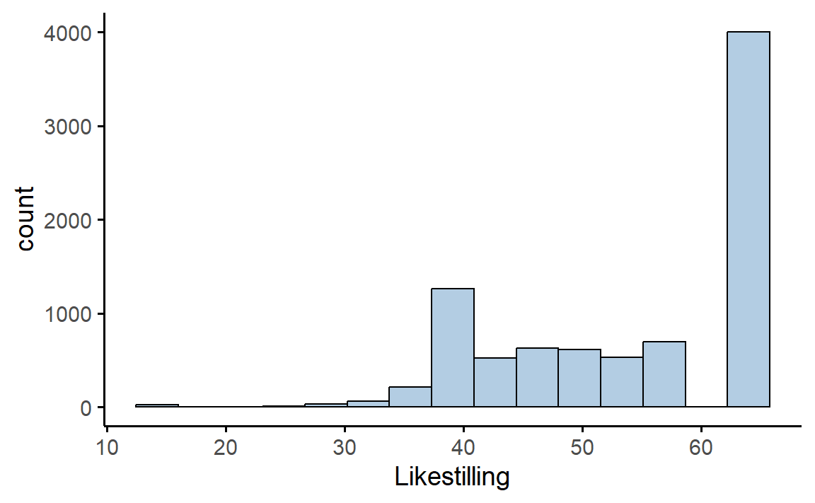 Prinsippet er enkelt: Du deler opp de mulige verdiene i intervaller og teller hvor mange observasjoner som faller innenfor hvert intervall. Denne tellingen kalles frekvensen eller tettheten til intervallet og vises som en vertikal stolpe. Jeg tror noe av grunnen til at de oppfattes som så enkle er at de minner om stolpediagrammer. For variabelen Likestilling finner vi for eksempel rundt 4000 elever som fikk max poengsum, noe som representeres av høyden på den høyre stolpen i histogrammet Figur 5.8, som vi også viste på starten av Figur 4.4.