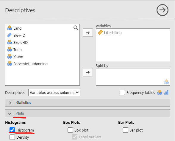 For å lage dette histogrammet i jamovi trykker vi “Analyses” → “Exploration” → “Descriptives” og velger “Plots” og “Histogram”, se Figur 5.9.