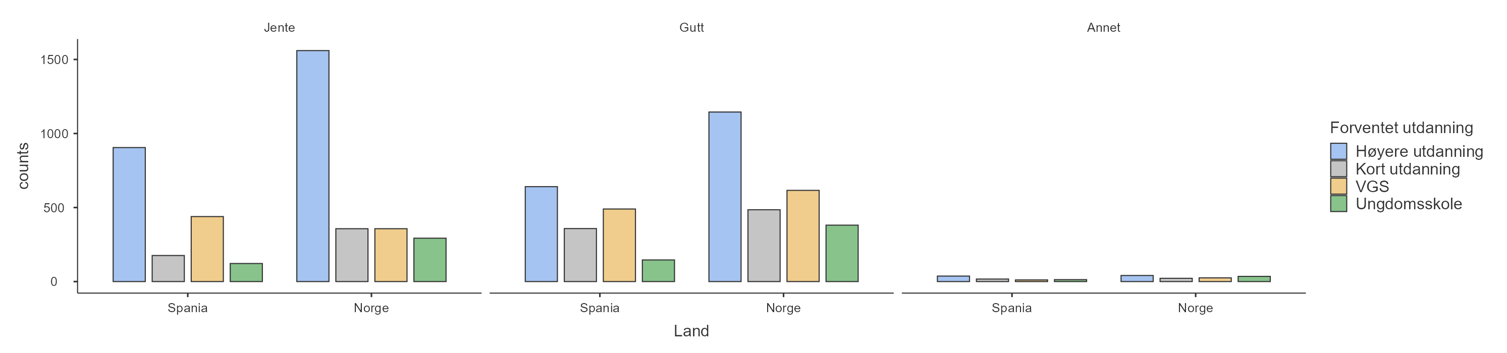 OK, nå fikk jeg blod på tann. Jeg vil gjøre undergruppeanalyse med enda en variabel! Jeg ønsker å se om det er kjønnsforskjeller i om elever ser for seg høyere utdanning i Spania og Norge, altså Forventet utdanning per Kjønn og Land. Vi legger ganske enkelt til enda en variabel i enten “Variables” eller “Split by”. På dette punktet bare sjonglerer jeg variable rundt mellom vinduene inntil jeg finner den figuren jeg liker best. I Figur 5.4 ser du resultatet av Land i “Variables” og Forventet utdanning og Kjønn i “Split by”.