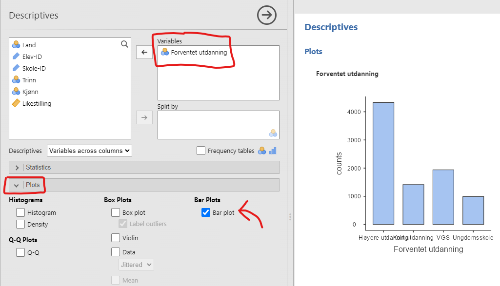 For å tegne et stolpediagram i jamovi trykker du “Analyses” → “Exploration” → “Descriptives” slik vi har gjort mange ganger før. Nå, derimot, må du trykke på “Plots” og krysse av for “Bar plot”, se Figur 5.2. I figuren har vi lagt til “Forventet utdanning” i variabelvinduet. Voilá, et flott stolpediagram. Siden “Forventet utdanning” er en ordinal variabel er stolpene tilogmed sortert i riktig rekkefølge.