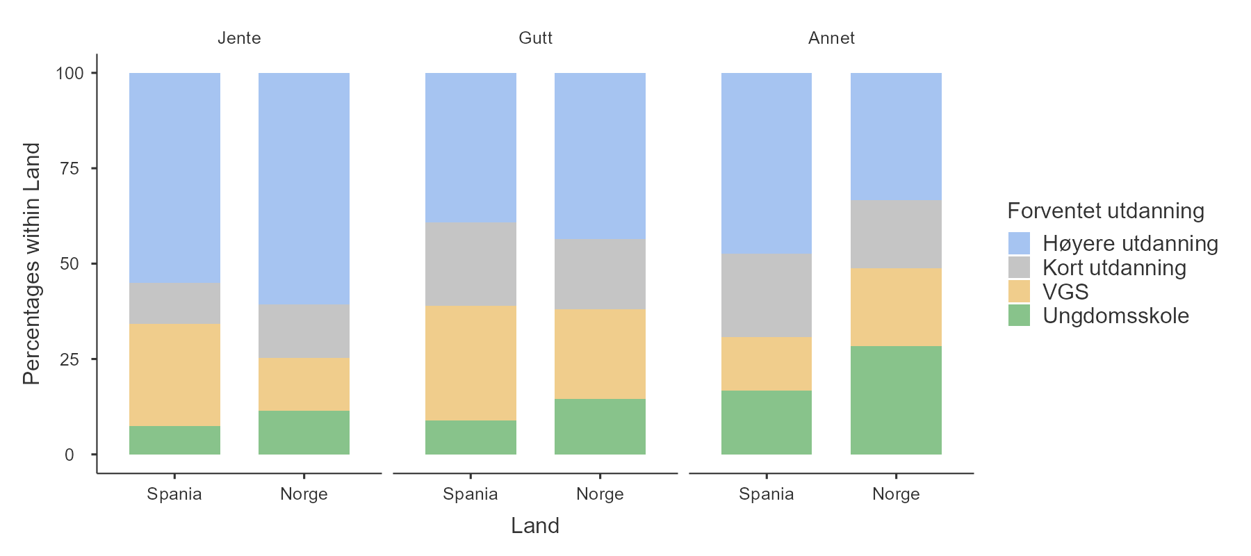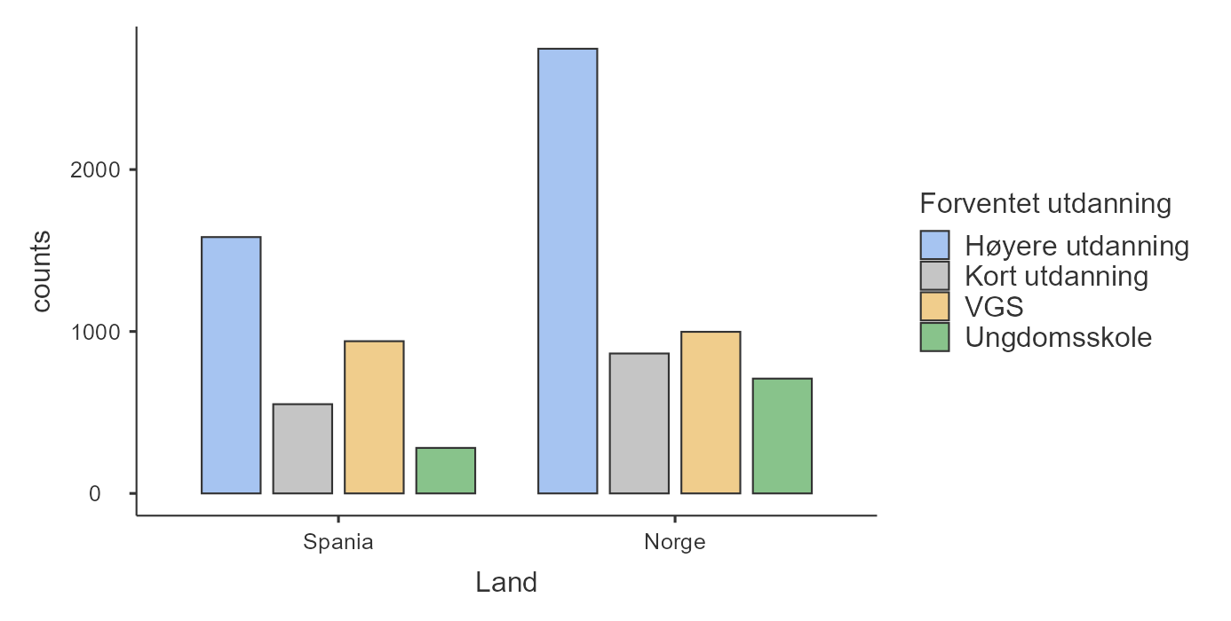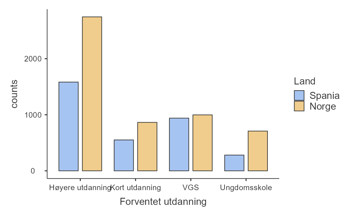 Resultatet ser du i Figur 5.6. Dette viser samme informasjon som Figur 5.3 (a), så du kan sammenligne og se hvilken du liker best. Forskjellen er at det stablede stolpediagrammet viser “andel innad i hvert land”. Her ser vi for eksempel at en noe større andel av de norske elevene planlegger høyere utdanning sammenlignet med de spanske elevene, men forskjellen er ganske liten. Hvis vi sammenligner med det vanlige stolpediagrammet, ser vi at dette viser absolutte tall. Der virker forskjellen mye større -– nesten dobbelt så mange norske som spanske elever ser for seg høyere utdanning! Grunnen til denne store forskjellen i stolpediagrammet er imidlertid at det er betydelig flere norske enn spanske elever i utvalget vårt (5317 mot 3355). Sannsynligvis er vi mer interessert i andelen elever som ser for seg høyere utdanning.