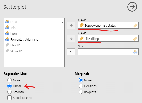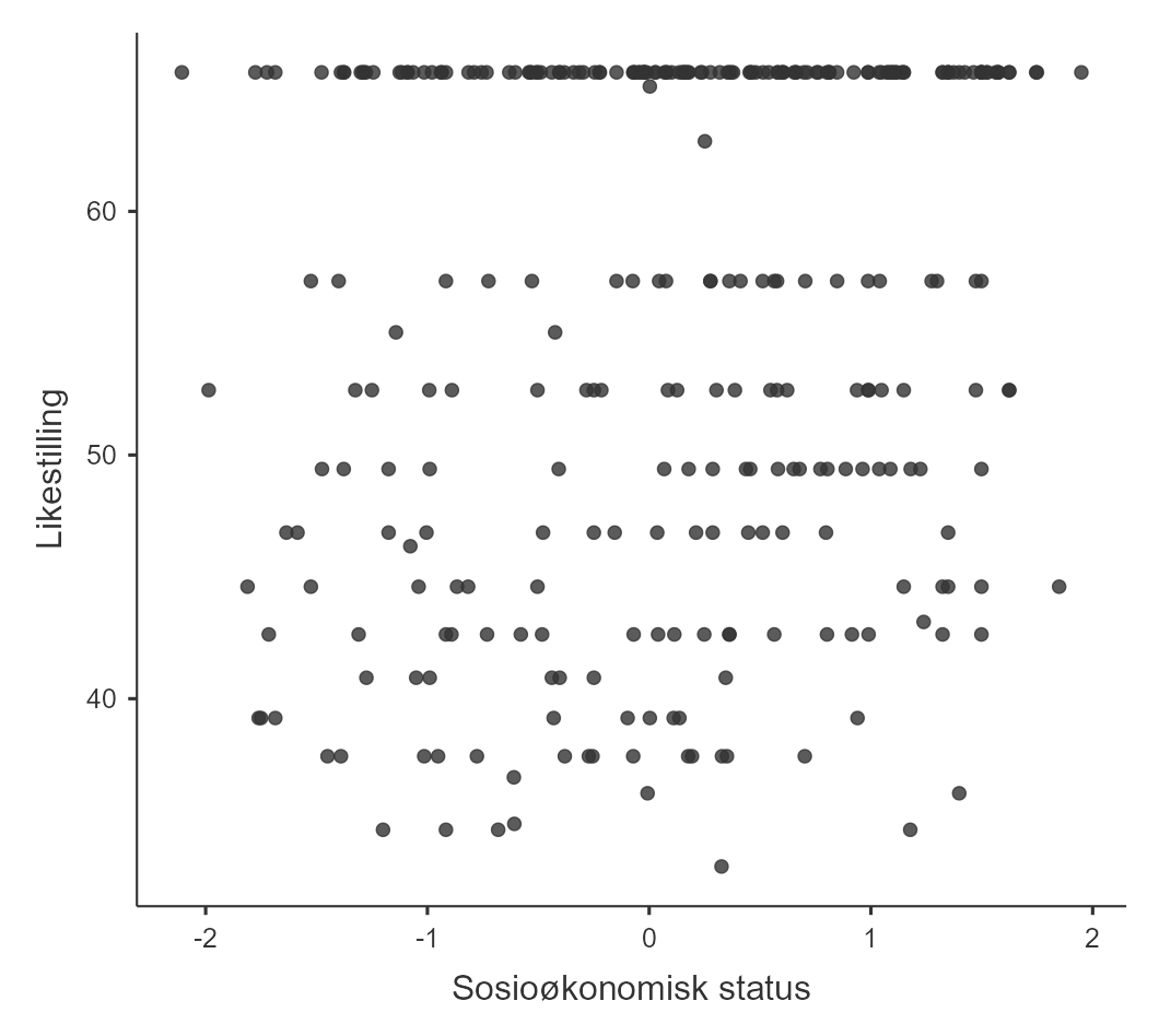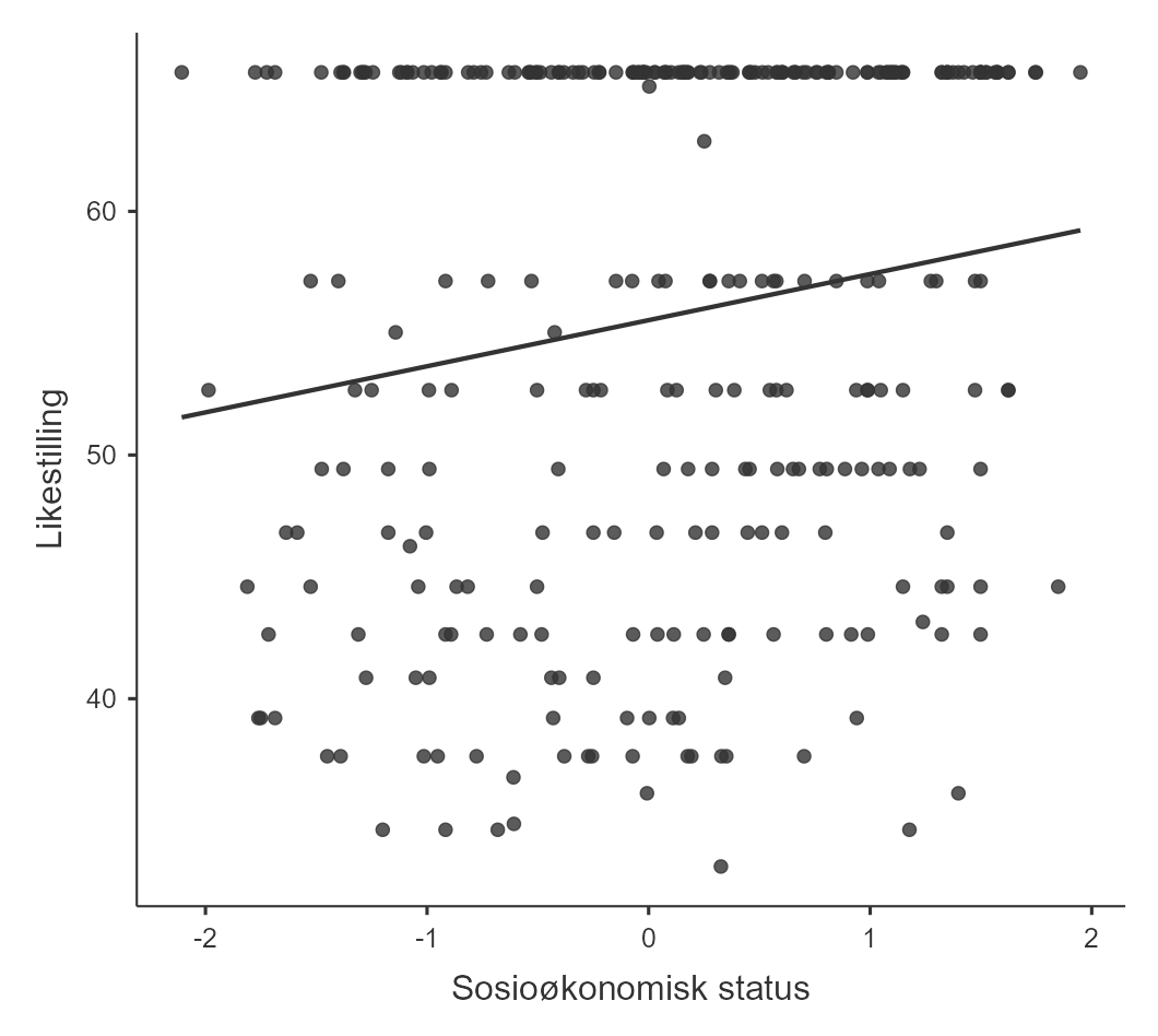 For å gjøre sammenhengen tydeligere er det vanlig å legge en linje over spredningsplottet, slik som i Figur 5.16. Den viser at det er en svak positiv tendens, altså at elever med høy sosioøkonomisk status svarer høyere på spørsmålene om likestilling. Du lærer mer om slike linjer, regresjonslinjer, i kapittelet om regresjon.