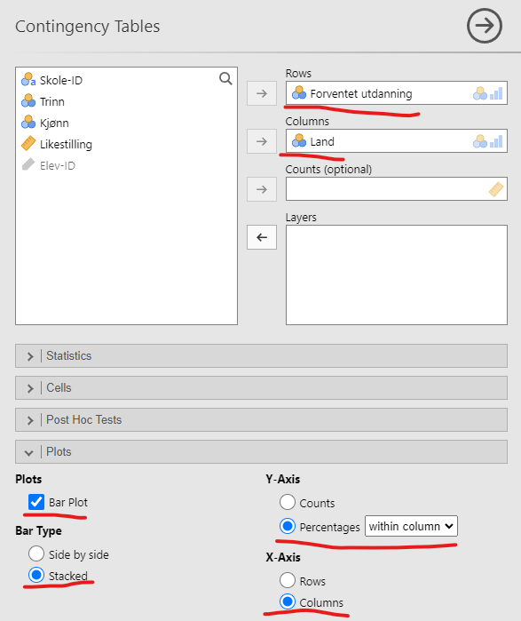 - Jeg legger inn Forventet utdanning på “Rows” og Land på “Columns”. Dette er smak og behag for hvordan tabellen “Contingency Tables”, som også genereres, blir seende ut.