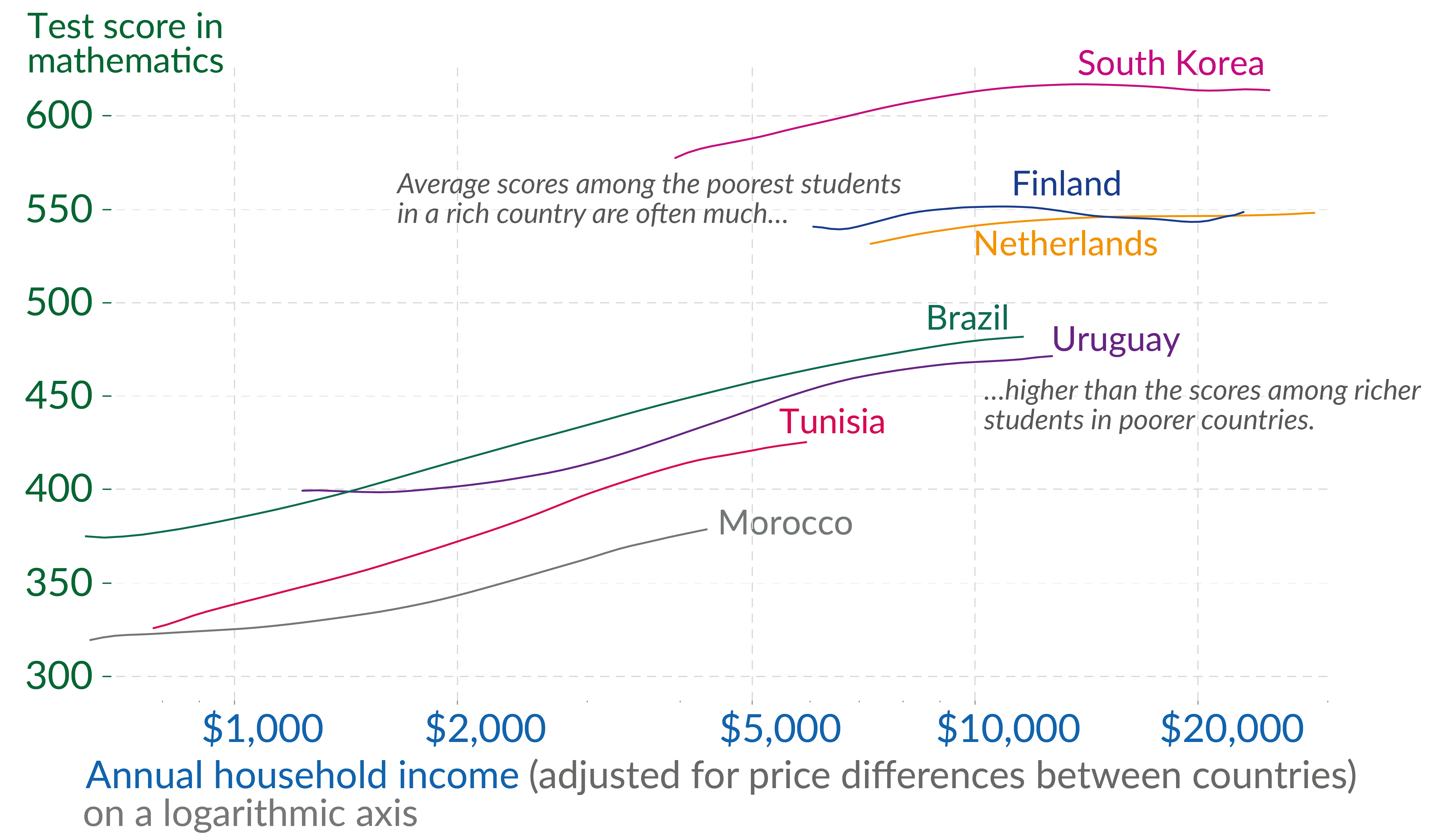 Det var et standard stolpediagram – andre diagrammer er spesiallagde. Se for eksempel på Figur 5.18, som på en fantastisk måte viser at ungene lærer mer i Sør-Korea, Finland og Nederland enn i Brasil og Uruguay, selv hvis man sammenlikner familier med samme kjøpekraft.
