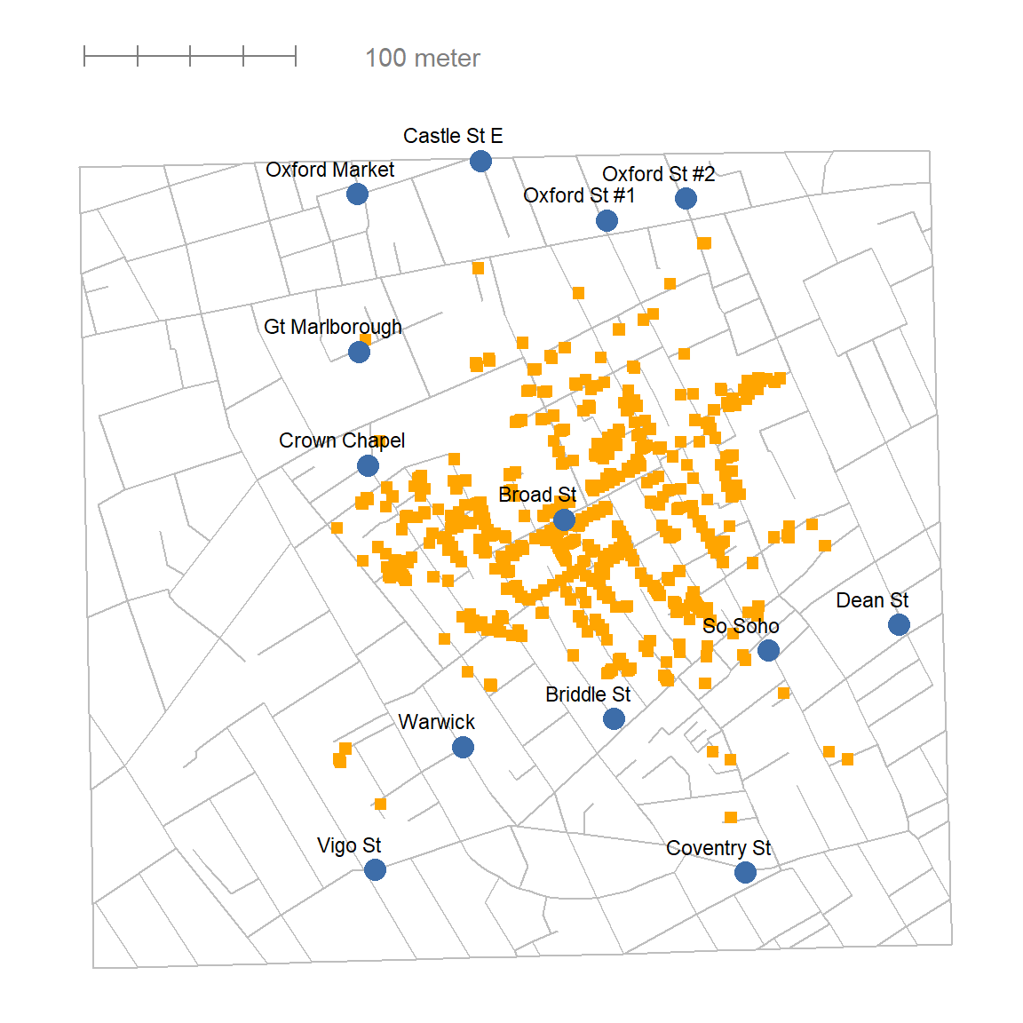 Det klassiske eksempelet for å vise hvor overbevisende og kraftfulle grafer kan være, er vist i Figur 5.1. Det er en stilisert versjon av en av de mest berømte grafene gjennom tidene – legen John Snow sitt kart over koleradødsfall fra 1854. Bakgrunnen er et kolerautbrudd som hadde tatt livet av over 500 personer. På den tiden forklarte man hvordan sykdommer smittet med miasme-teorien. Denne teorien hadde vært til stor hjelp og hjalp leger med gode tiltak mot mange sykdommer, for eksempel bruk av munnbind og begraving av lik langt unna folk. At sykdom kunne smitte via vann var uhørt, og John Snow vant ikke gjennom med argumentene sine om at kolera smittet fra vannpumpen på Broad Street. Derfor lagde han en figur. Figuren er elegant, det er rett og slett et gatekart som viser vannpumper (blå stor prikk) og addressen til personer som døde av kolera (gul liten prikk). Selv et kjapt blikk på grafen gjør det klart at vannpumpen i Broad Street er en mistenkt. Med figuren klarte han å overbevise myndighetene om å fjerne håndtaket på pumpen, noe som stoppet utbruddet. Slik er kraften i en god datavisualisering.