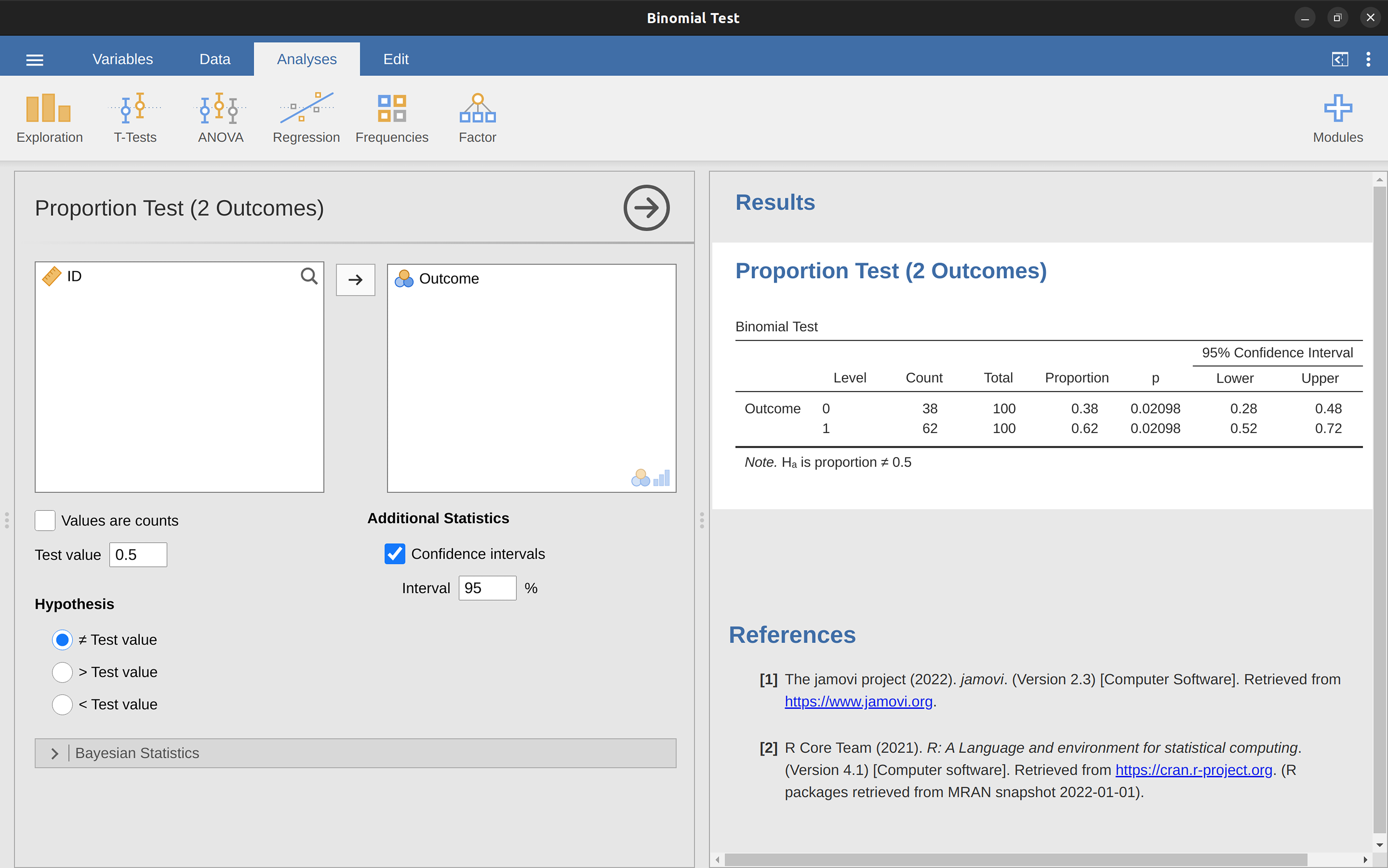 Testen finnes i jamovi som en av de statistiske analysene som er tilgjengelige når du klikker på ‘Frequencies’-knappen og heter der “2 outcomes binomial test”. For å teste nullhypotesen om at sannsynligheten er 0{,}5, bruker vi data der X = 62 av N = 100 personer ga riktig respons. Disse dataene finner du i datafilen binomialtest.omv som du kan åpne i jamovi. I dataene er det 100 rader, én for hver forsøksperson, og en variabel “Outcome” som har verdien 0 (gjettet ikke riktig) eller 1 (gjettet riktig). Resultatene vises i Figur 8.5.