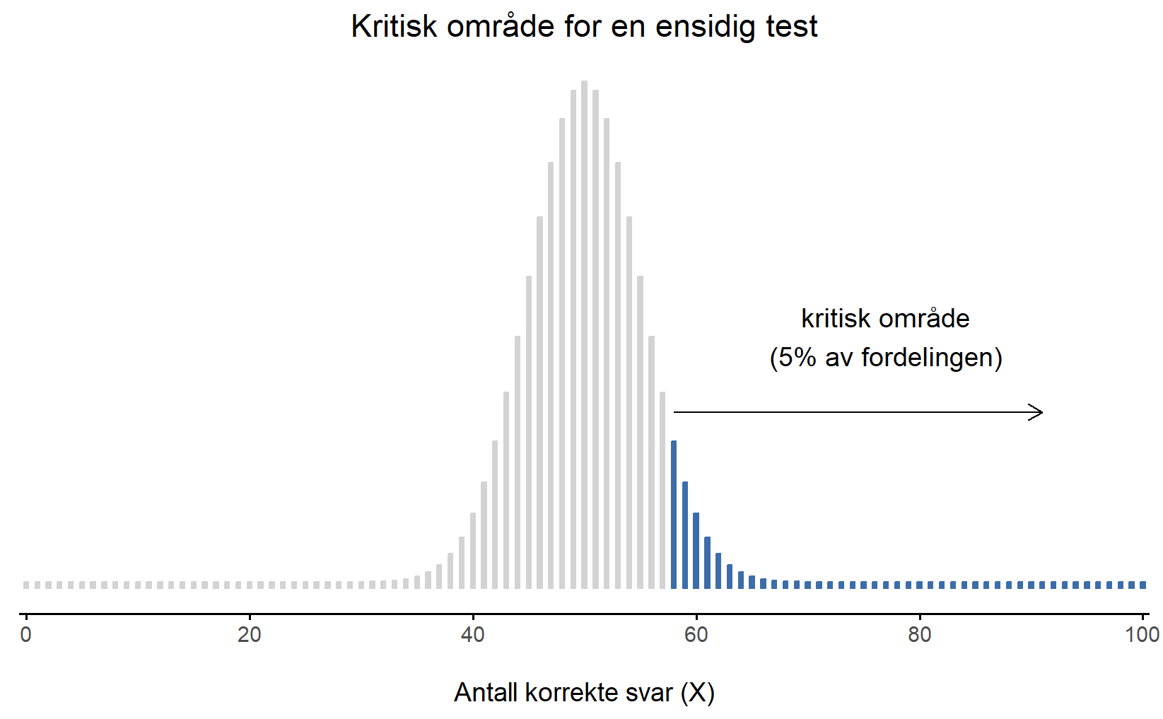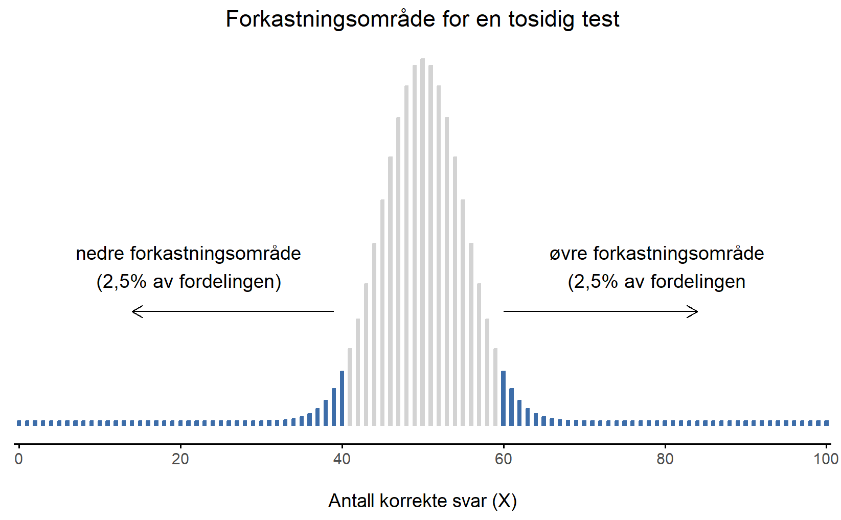Forkastningsområdet består derfor av de 5% (eller \alpha) mest ekstreme verdiene, kjent som halene til fordelingen. Dette er illustrert i Figur 8.2. Siden vi ønsker \alpha = 5%, så tilsvarer forkastningsområdet X \leq 40 og X \geq 60. Det vil si, hvis antallet personer som sier kortets riktige farge er mellom 41 og 59, så bør vi beholde nullhypotesen. Hvis antallet er mellom 0 og 40 eller mellom 60 og 100, så bør vi forkaste nullhypotesen. Tallene 40 og 60 kalles de kritiske verdiene og siden de utgjør grensene for forkastningsområdet.