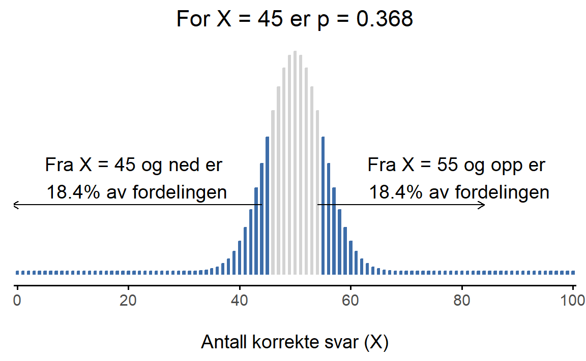 Hver eneste verdi X av testobservatoren svarer til én p-verdi, og den finner du på følgende måte. La oss si at X = 45. Da spør vi oss “hvor stor andel av fordelingen ligger i ‘halene’ utenfor denne verdien”? Da må vi finne ut hvor mye av fordelingen som ligger utenfor X = 45 og X = 55. Dette er vist i Figur 8.4 (a). Vi ser at hver “hale” utgjør 18,4% av fordelingen, slik at 36,8% av fordelingen er lenger unna. Dette er p-verdien, og vi skriver p = 0{,}368. Dette betyr “36,8% av testobservatorens fordeling ligger lenger unna den verdien du ville forventet ut fra nullhypotesen”. Det betyr at det er ganske vanlig få testobservatorer mindre enn X = 45 og større enn X = 55. Dette tolker vi som at X = 45 er en verdi som er kompatibel med nullhypotesen.