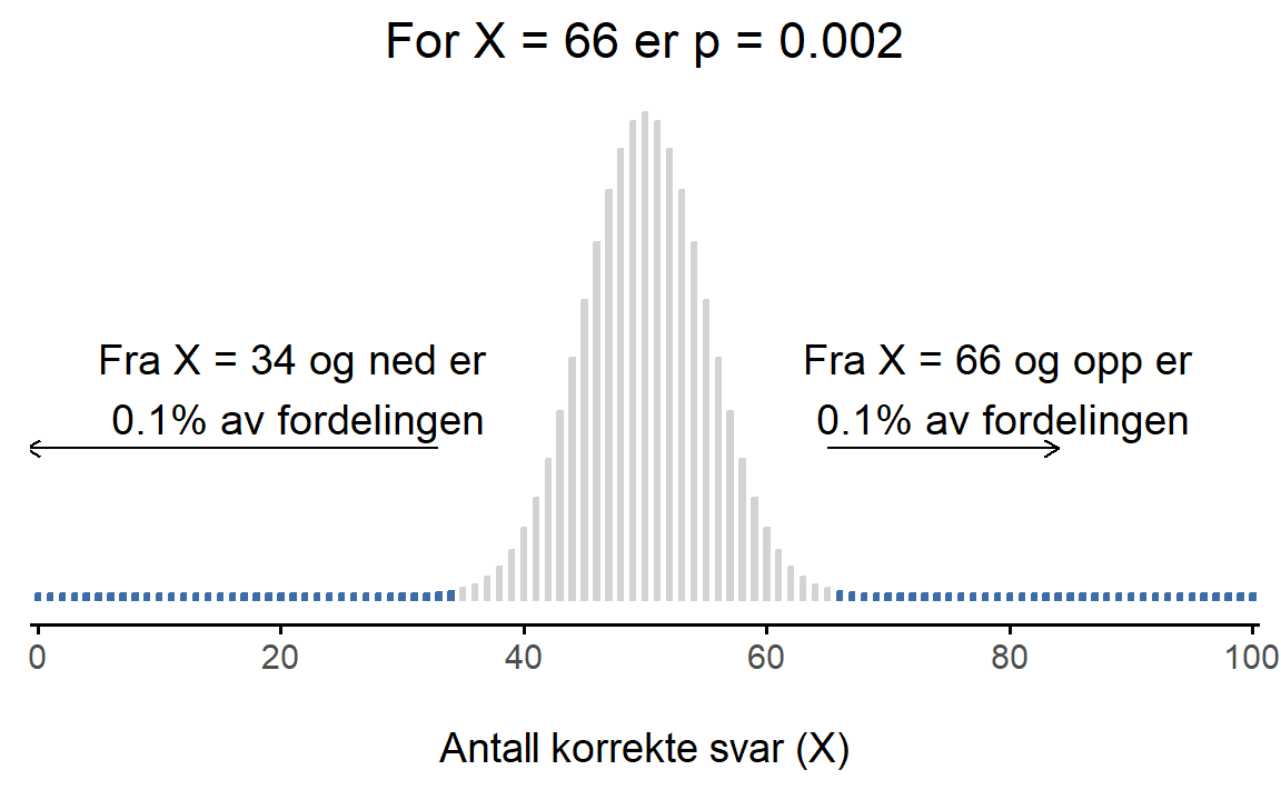 I Figur 8.4 (b) ser vi at halene utenfor X = 66 utgjør 0{,}1\% av fordelingen, altså at p = 0{,}002. Det betyr at det er svært sjeldent å få en testobservator som er mer ekstrem enn X = 66, altså som er større enn 66 eller mindre enn 34. Dette tolker vi som at X = 66 er en verdi som er lite kompatibel med nullhypotesen.