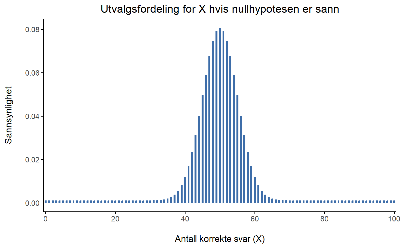 Nullhypotesen sier at X er binomialfordelt med \theta = 0{,}5 og N = 100. Dette gir utvalgsfordelingen, som vi ser i Figur 8.1. Figuren viser at fordelingen til testobservatoren er X = 50 og at vi nesten sikkert vil se et sted mellom 40 og 60 riktige svar.
